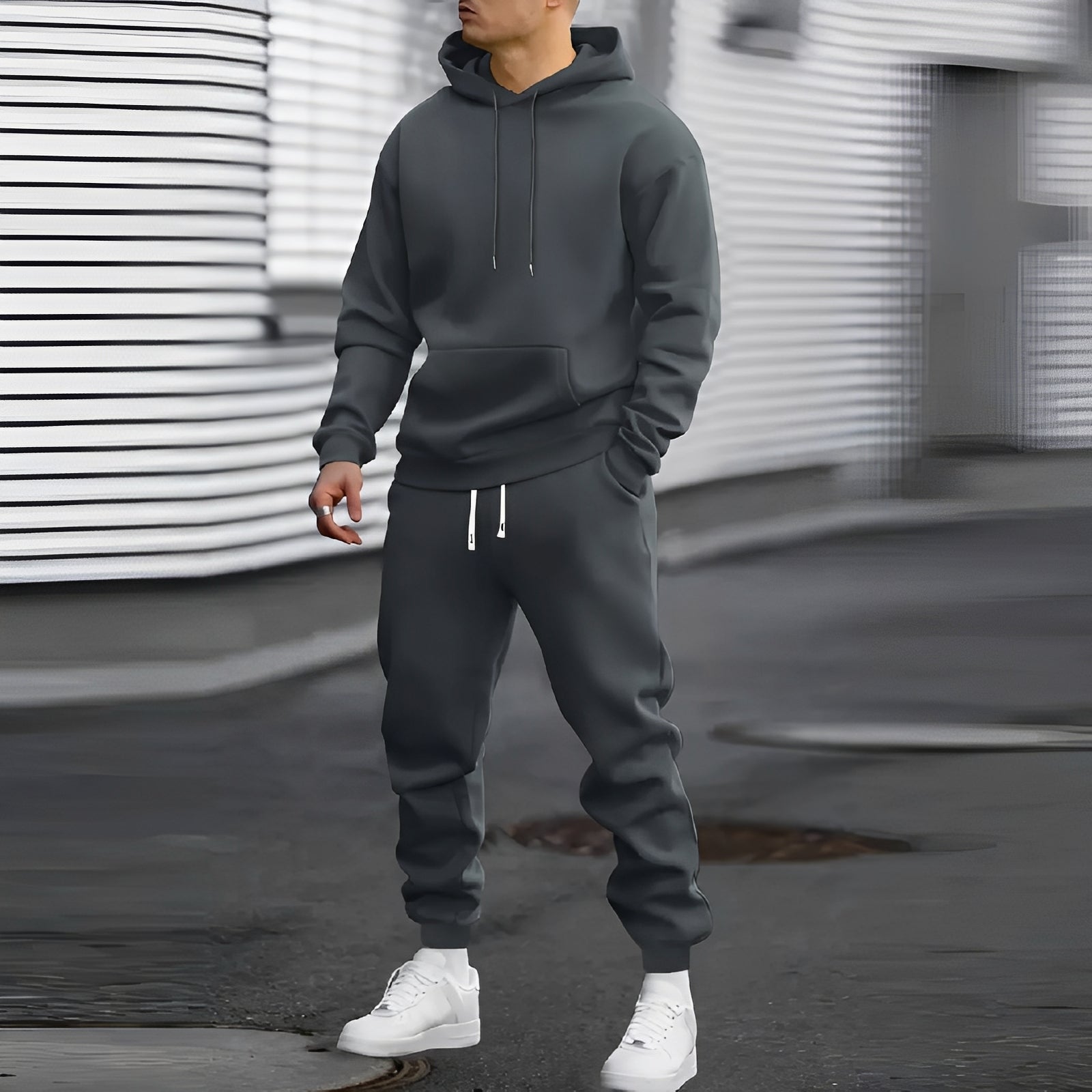 Zestaw Aamon dla mężczyzn to wygodna bluza z kapturem i dopasowane spodnie dresowe, idealne do sportu i swobodnych wyjść. Wykonany z miękkiego i oddychającego materiału, zapewnia komfort przez cały dzień, równocześnie dając ciepło i swobodę ruchu. Nowoczesny krój gwarantuje stylowy wygląd, bez względu na to, czy jesteś na zakupach, czy na treningu. Dzięki praktycznym kieszeniom i eleganckiemu wyglądowi jest zarówno funkcjonalny, jak i modny. To konieczny zestaw dla mężczyzn, którzy cenią wygodę, styl i uniwersalność.