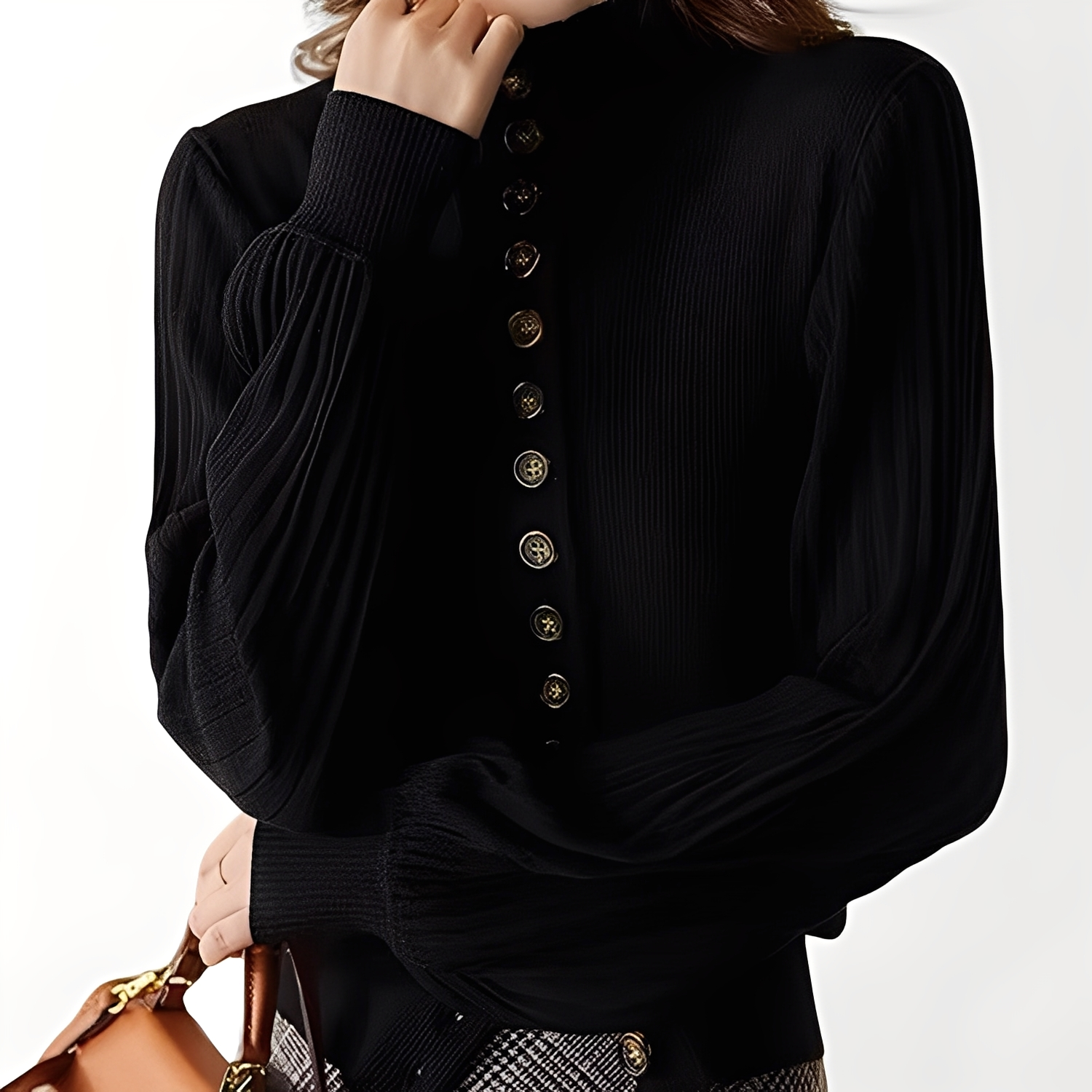 Swetrowy top Adelyn łączy klasyczną elegancję z nowoczesnymi akcentami. Stójka i ozdobne guziki dodają szyku, a rękawy latarnia tworzą kobiecy i lekki styl. Idealny do dodania elegancji codziennym strojom lub na specjalne okazje.