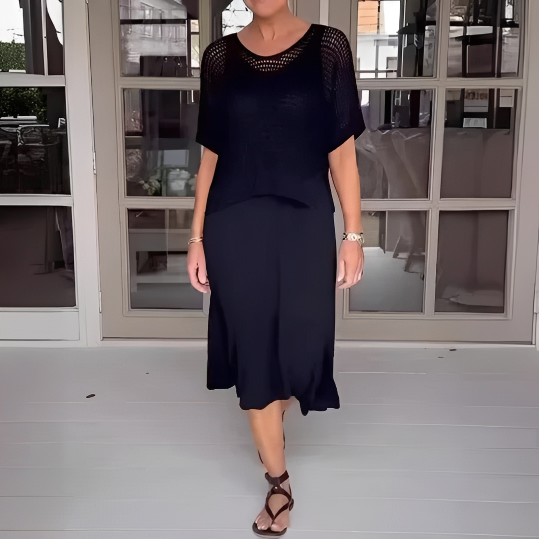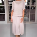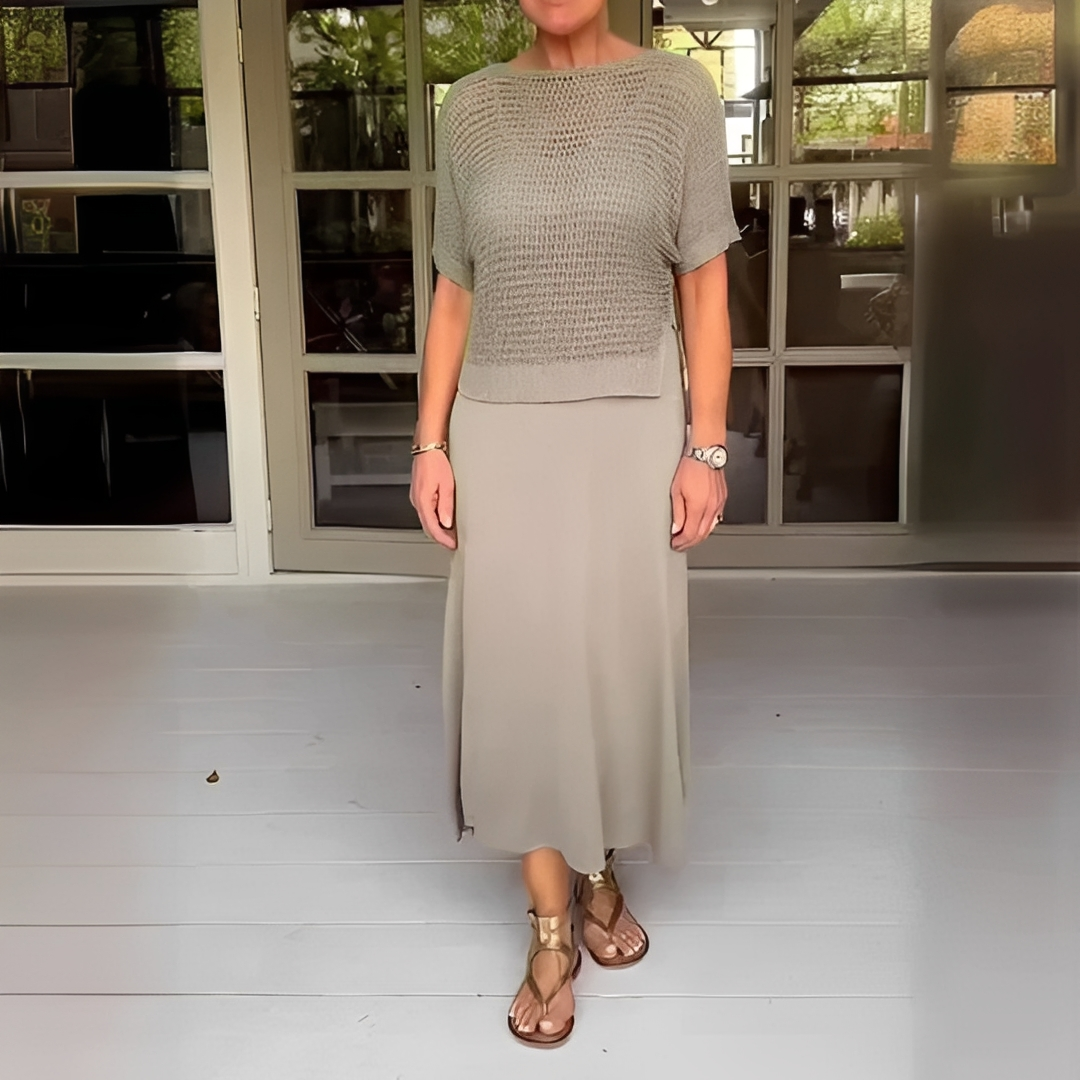 Stylowy komfort na każdą okazję:Dwu-częściowy komplet Almera łączy klasyczną elegancję z lekkością i komfortem oddychającym. W skład zestawu wchodzi ażurowa dzianinowa bluzka z krótkim rękawem oraz długa, przewiewna spódnica, idealna na relaksacyjne wyjścia, do pracy czy na wieczorną kolację. Miękka i oddychająca tkanina zapewnia komfort przez cały dzień, podkreślając jednocześnie każdą sylwetkę. Jego uniwersalny wygląd pozwala łatwo dopasować go do innych niezbędnych elementów garderoby. Z Almera zyskujesz elegancki i funkcjonalny komplet.