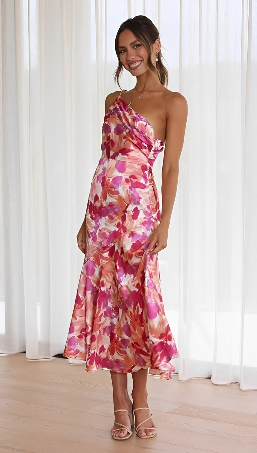 Ta sukienka midi zachwyca eleganckim kwiatowymwzoremi asymetrycznym krojem, który nadaje nowoczesny akcent. Płynna tkanina delikatnie opada, tworząc pochlebną sylwetkę. Przyjemna w noszeniu, idealna na wyjątkowe okazje, wydarzenia lub letnie przyjęcia. Sukienka, która harmonijnie łączy styl i kobiecy urok.