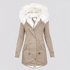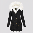 Ashley - Stylowy damski płaszcz z kapturem i futrzanym kołnierzem
