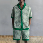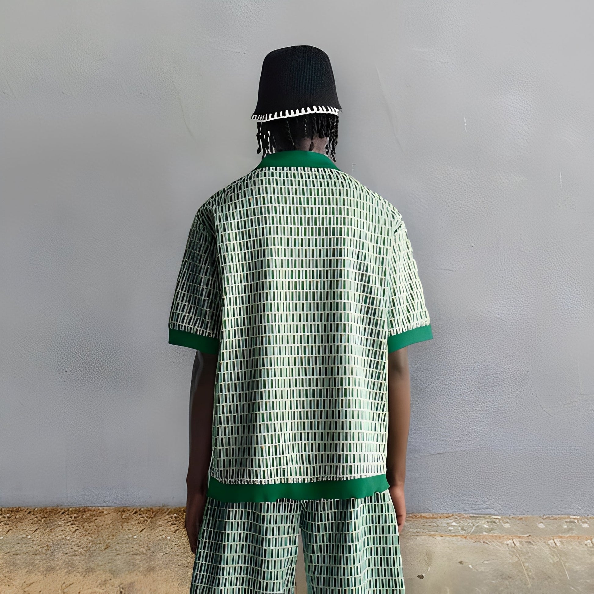Męski zestaw koszuli i szortów z geometrycznym wzorem Atem został zaprojektowany, by dawać elegancki i czysty wygląd bez wysiłku. Składa się z koszuli na guziki i pasujących szortów, oferując styl na gorące dni. Lekka, przewiewna tkanina zapewnia wygodę przez cały dzień, niezależnie czy jesteś na wakacjach, z przyjaciółmi, czy odpoczywasz. Wyrazisty geometryczny wzór dodaje nowoczesności i łatwo go dopasować. Niezbędny zestaw dla mężczyzn ceniących komfort i styl.