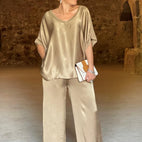 - Komfortowe dopasowanie – Satynowa bluzka i spodnie gwarantują elastyczne i wygodne dopasowanie, które jest równie komfortowe, co stylowe.
