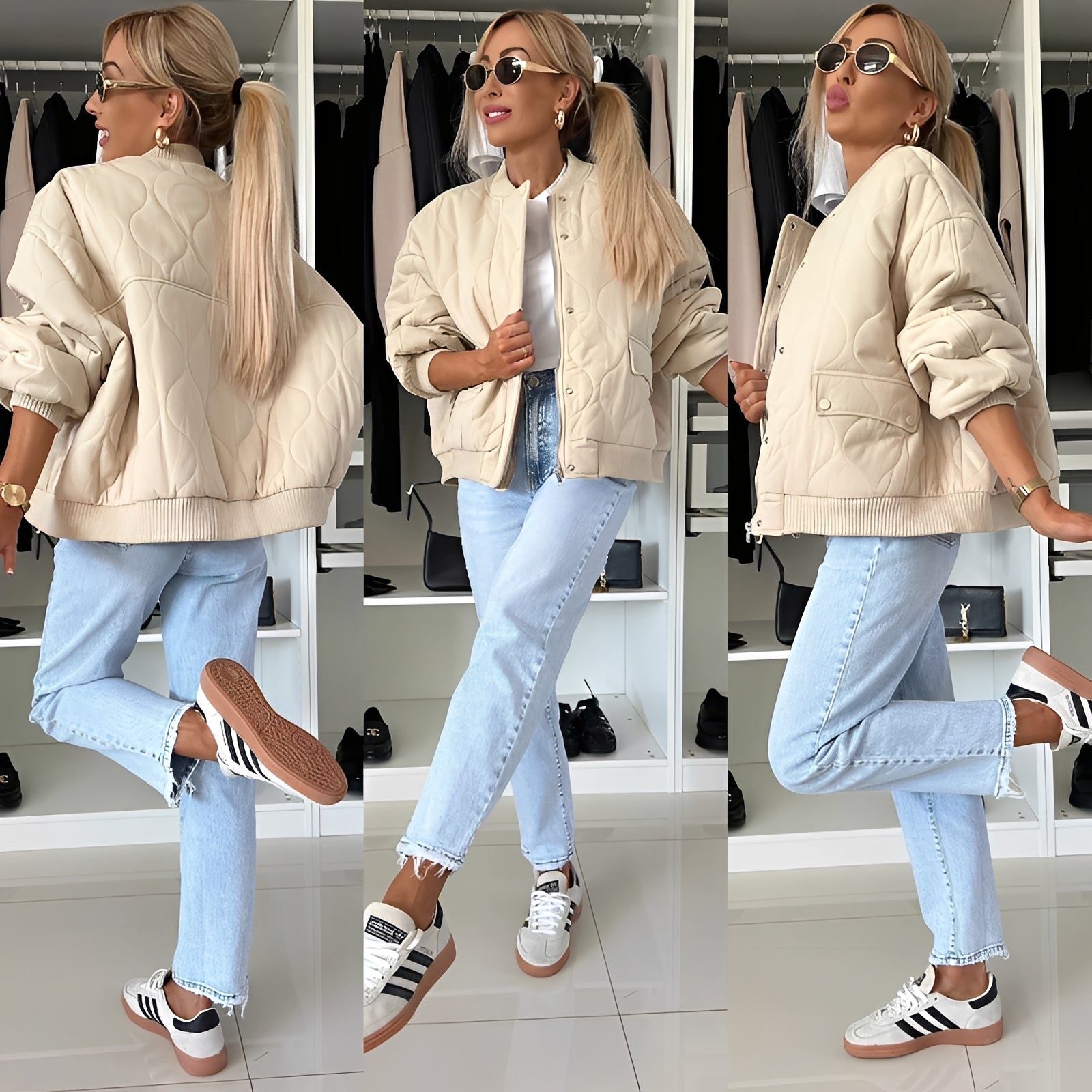 Bomberka „Carmen” łączy klasyczny styl streetwear z nowoczesnymi akcentami. Jej luźny krój i miękkie tkaniny zapewniają najwyższy komfort – doskonała na zmienne pory roku lub chłodne letnie wieczory. Boczne kieszenie dają miejsce na przechowywanie, a elastyczne ściągacze na rękawach i dole zapewniają świetne dopasowanie. Bez względu na to, czy to luźny, czy sportowy styl – ta kurtka pasuje do Ciebie.
