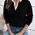 Sweter „Corrina” łączy delikatny wzór dzianiny z szykownymi akcentami. Miękki materiał zapewnia komfort, a subtelne koronkowe ozdoby dodają mu kobiecości. Znakomity do noszenia na co dzień, do pracy czy na chwile relaksu – stylowy partner na cały rok.