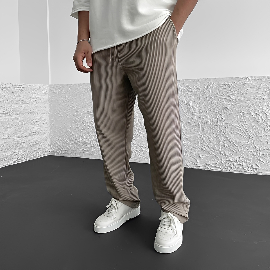 Odśwież swoją codzienną szafę z prążkowanymi spodniami Derick dla mężczyzn, które łączą wygodę ze stylem. Zrobione z miękkiego i rozciągliwego materiału, oferują luźny krój, który dostosowuje się do twoich ruchów, zachowując przy tym nowoczesny i elegancki wygląd. Prążkowana faktura dodaje modnego i męskiego akcentu, czyniąc je doskonałymi do odpoczynku, na zakupy czy swobodne wyjścia. Lekkie, a zarazem wytrzymałe, te spodnie łączą praktyczność z nowoczesnym stylem, sprawdzając się o każdej porze roku. Doświadcz doskonałej harmonii między wygodą, uniwersalnością a nowoczesną modą w swojej codziennej garderobie.