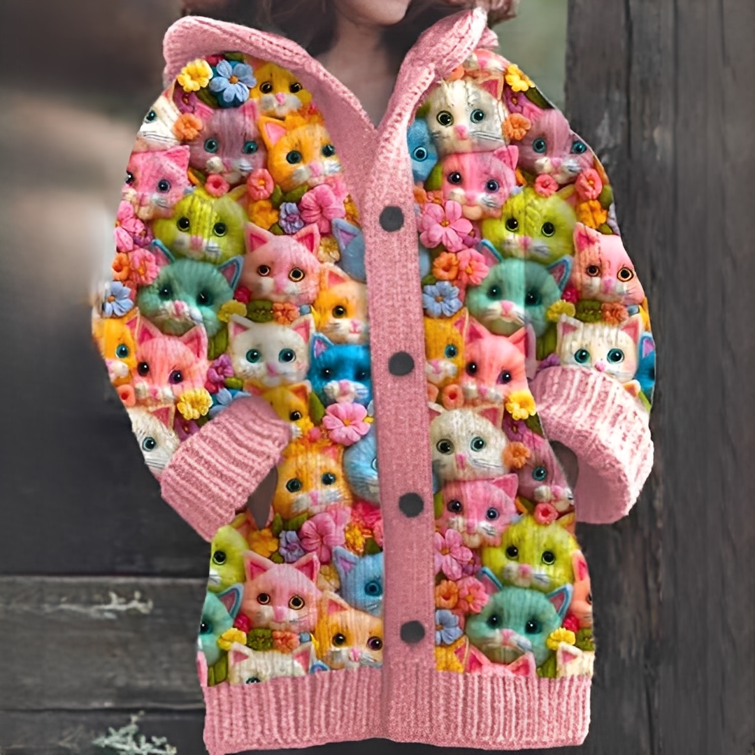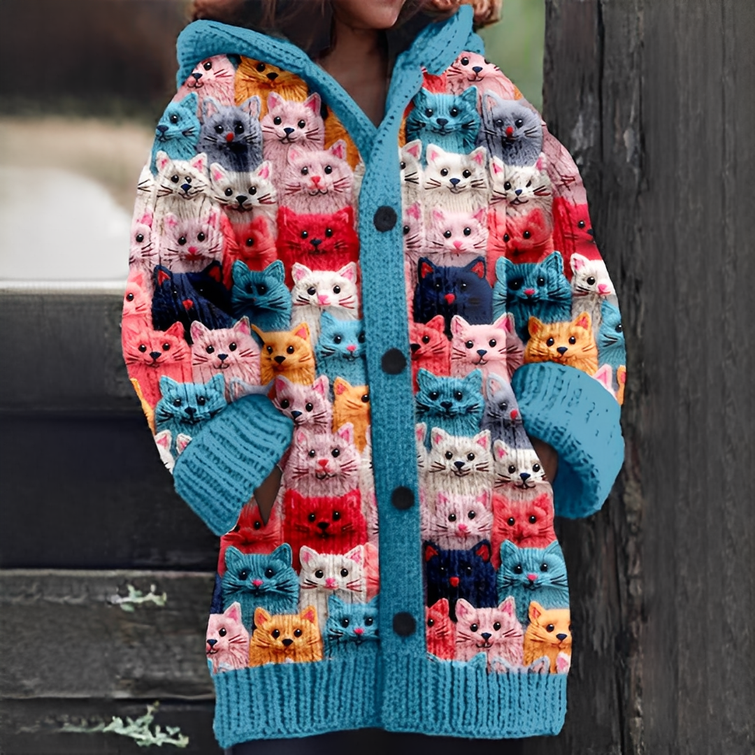 Kardigan damski z kocim motywem, który łączy ciepło, modę i codzienny urok.