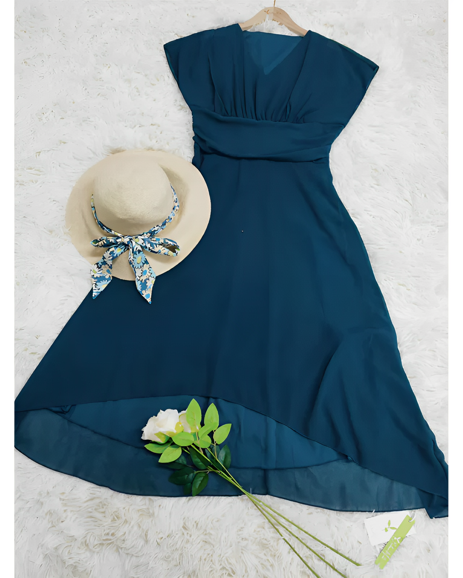 Ta elegancka sukienka midi z dekoltem V i rozkloszowanym krojem łączy klasyczną elegancję z pochlebnym dopasowaniem. Zwiewna spódnica zapewnia delikatne ruchy, podczas gdy głęboki dekolt podkreśla kobiecą sylwetkę. Idealna na wesela, spotkania biznesowe lub stylowe wieczorne wydarzenia.