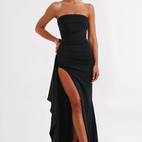 Zrób niezapomniane wrażenie z Velara Długa suknia bez ramiączek, idealne połączenie stylu i wdzięku. Uszyta z wysokiej jakości rozciągliwej krepy, ta suknia świetnie dopasowuje się do ciała, gwarantując perfekcyjne dopasowanie. Krój odkrywający plecy i ramiona, z marszczeniami przy biuście i talii, subtelnie podkreśla figurę. Ze śmiałym rozcięciem na udzie i eleganckimi drapowaniami, ta długa suknia jest doskonała na wiosenne i letnie okazje, niezależnie od tego, czy to eleganckie przyjęcie czy wytworna kolacja.