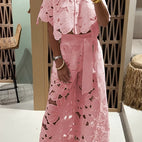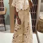 Ten stylowy zestaw łączy luźno opadającą górę z pasującymi spodniami, tworząc harmonijny wygląd. Drobne detale nadają projektowi elegancki wygląd. Przyjemny krój zapewnia wysoki komfort noszenia. Idealny na wyjątkowe okazje lub stylowe wystąpienia. Zestaw, który bez wysiłku przekazuje elegancję.
