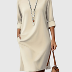 Sukienka Laure ucieleśnia naturalną elegancję, zaprojektowaną, aby towarzyszyć Twoim dniom z łatwością i stylem. Jej płynny prosty krój oferuje harmonijny spadek, który podkreśla sylwetkę, jednocześnie zapewniając dużą swobodę ruchów. Miękki i oddychający materiał delikatnie przesuwa się po skórze, nie odciskając, idealny do długotrwałego noszenia. Podwinięte rękawy 3/4 i okrągły dekolt dodają wyrafinowanego i dyskretnego akcentu. Idealna na jesień i zimę, nosi się ją zarówno samodzielnie, jak i z marynarką lub długim płaszczem.