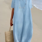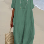 Sukienka Leilani zachwyca swoim luźnym, swobodnym krojem i przewiewnym dekoltem V, który dodaje letniej lekkości. Krótkie rękawy zapewniają swobodę ruchów i sprawiają, że sukienka jest idealna na plażę, wycieczki lub relaksujące dni w domu. Lekki i oddychający materiał delikatnie przylega do skóry, oferując optymalny komfort nawet przy wysokich temperaturach. Dzięki ponadczasowemu designowi Leilani można łączyć na wiele sposobów i pasuje na wiele okazji. Ciesz się swobodną elegancją przez całe lato.Dlaczego "Leilani" powinna być w Twojej szafie:Luźny krój dla maksymalnej swobody ruchówLekki i oddychający materiał dla wysokiego komfortuProsty i ponadczasowy design dla wszechstronnych stylizacji