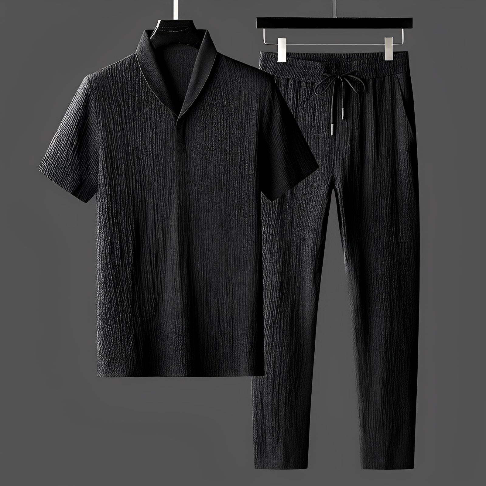 Doświadcz wygody przez cały dzień z eleganckim zestawem Leonard, zawierającym koszulę i spodnie wykonane z wysokiej jakości tkanin. Miękki, przewiewny i lekki, zapewnia chłód i zadbany, modny wygląd. Idealny na codzienne wyjścia, pracę z domu i weekendowy relaks, zestaw łączy uniwersalność z nowoczesną elegancją. Dostępny w kolorach klasycznej czerni i bieli, został stworzony, by podnieść standardy codziennego ubioru bez wysiłku. Tradycyjny krój gwarantuje maksymalny komfort bez rezygnacji ze stylu.