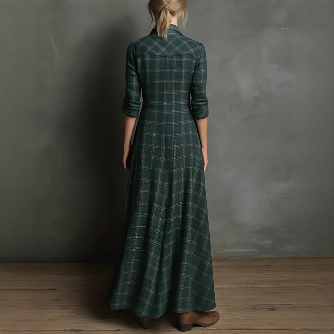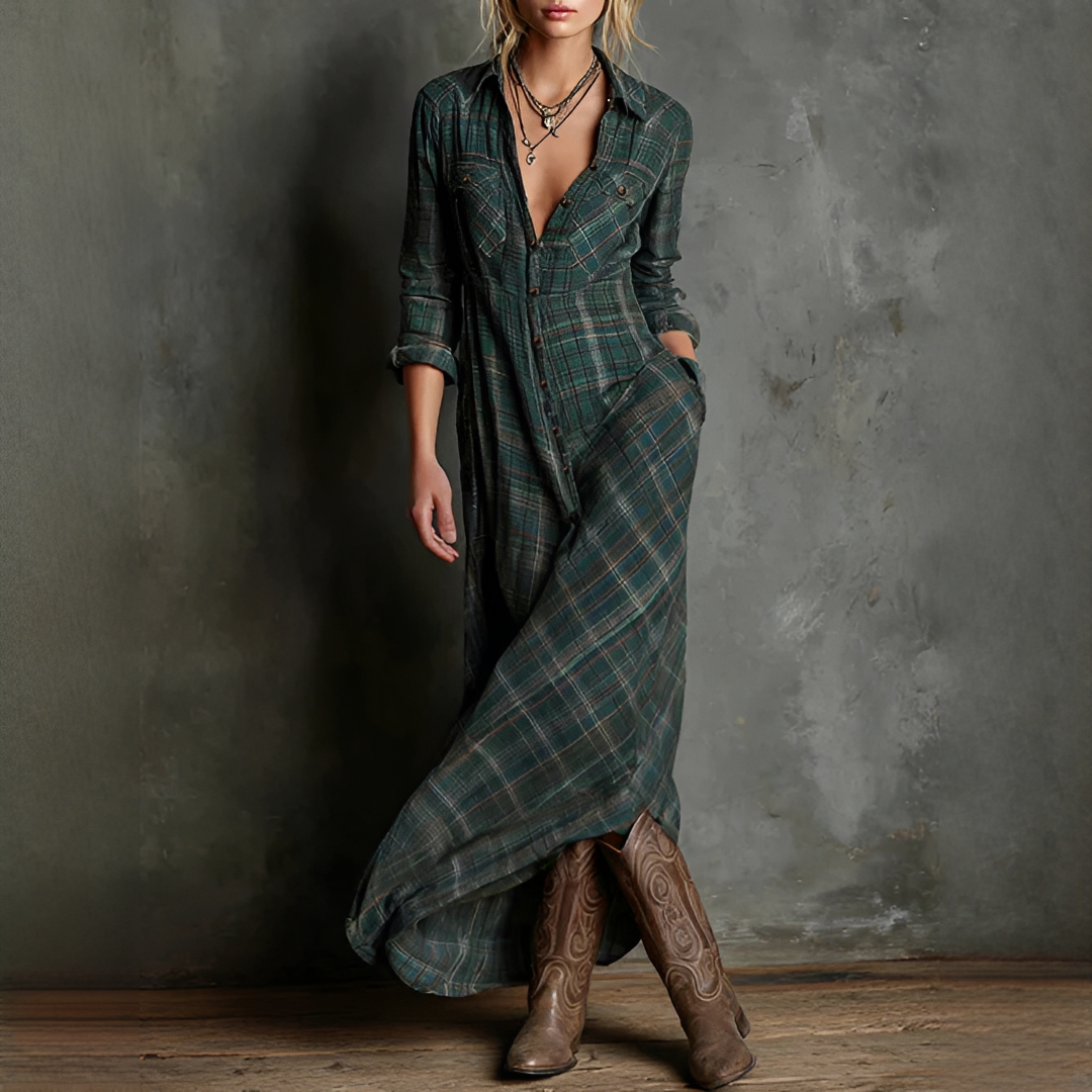 Ta długa sukienka Lilly łączy w sobie elegancję i komfort przez cały dzień. Zielony kraciasty kołnierz dodaje modnego akcentu, podczas gdy swobodny krój podkreśla sylwetkę i umożliwia łatwe poruszanie się. Wykonana z miękkiego i oddychającego materiału, idealna na co dzień, na luźne wyjścia lub na relaksujące wydarzenia w weekend. Jej wszechstronny styl można uzupełnić obcasami lub pozostać w luźnym stylu z płaskimi butami lub sandałami. Niezbędny element w eleganckiej i komfortowej garderobie.