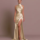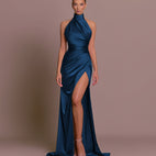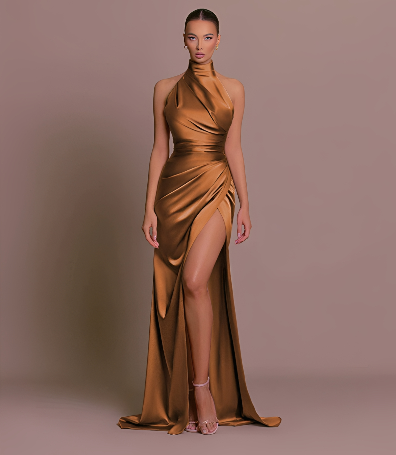 Ta suknia wieczorowa zachwyca eleganckim krojem z wiązaniem na szyi i wysokim rozcięciem. Płynny materiał miękko opada i stylowo podkreśla sylwetkę. Krój jest nowoczesny i jednocześnie kobiecy. Przyjemna w noszeniu i wizualnie bardzo elegancka. Idealna na wieczorne wydarzenia, gale lub uroczyste okazje.
