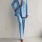 Odkryj zestaw Marva z żakietem i spodniami – elegancki damski garnitur, dostępny w modnych kolorach: jasnoniebieski, czarny, różowy i turkusowy. Nowoczesny żakiet i pasujące spodnie zachwycają dopasowanym krojem i starannym wykonaniem z elastycznego materiału, który zapewnia komfort przez cały dzień. Ten ponadczasowy zestaw nadaje się do biura, na spotkania i uroczyste okazje, a także łatwo łączy się zarówno z formalnymi, jak i casualowymi stylizacjami.