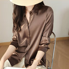 Ulepsz swoją garderobę z naszą satynową bluzką z długimi rękawami i guzikami, gdzie elegancja spotyka się z codziennym komfortem.