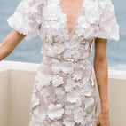 Pozwól swojemu stylowi rozkwitnąć – z Mira, minisukienką, która łączy kobiecą elegancję z figlarnymi detalami. Dopasowana sylwetka podkreśla Twoje krągłości, podczas gdy bufiaste rękawy i głęboki dekolt w kształcie litery V zapewniają pewny siebie, nowoczesny wygląd. Delikatne kwiatowe hafty dopełniają design, czyniąc Mira idealnym towarzyszem na wyjątkowe okazje lub ekscytujące wieczory.
