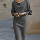 Sukienka Wendy Midi Wyrafinowana z Drapowanym Kołnierzem ucieleśnia wyrafinowanie i elegancję w każdym detalu. Jej elegancki drapowany kołnierz i midi kroju tworzą wyrafinowaną i ponadczasową sylwetkę, idealną na każdą okazję. Wykonana z miękkiego i zwiewnego materiału, ta sukienka doskonale dopasowuje się do sylwetki, zapewniając jednocześnie optymalny komfort. Niezależnie od tego, czy to elegancki dzień, czy szykowny wieczór, ta sukienka jest doskonałym wyborem, aby promieniować stylem.