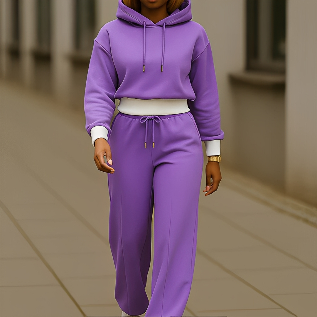 - Elegancki, spójny zestaw: bluza z kapturem i spodnie dresowe tworzą jednolity, wyrafinowany, swobodny styl.